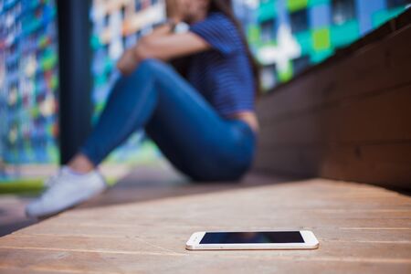 A smartphone lying in the foreground, on a blurred background, a girl, a brunette with long hair in jeans and white sneakers, crying, covering her face with her hands while sitting with her legs on a wooden bench. Side view.