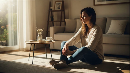 A young woman sits on the floor hugging her knees, looking out a window bathed in warm golden sunlight. A potted plant sits on the sill, contributing to the peaceful, contemplative, and slightly melancholic mood.
