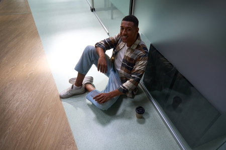 African American guy sitting on the floor, holding smartphone in the office