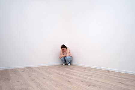 Sad woman sitting alone in room corner with hands on face. Concept of depression, loneliness, mental health issue, domestic violence, isolation, and stress.