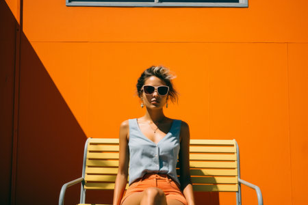 a woman sitting on a bench in front of an orange wall