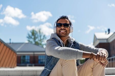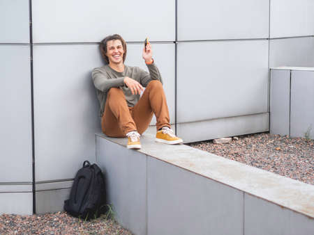Young man relaxing on a bench in downtown district listening to music. high quality photo
