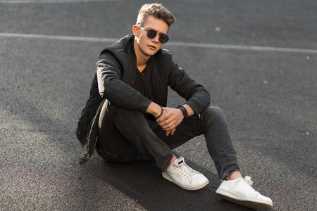 Young handsome hipster guy with sunglasses in fashionable black clothes with jacket and stylish white sneakers sitting on the street