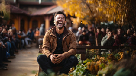 Portrait of a young man sitting in the autumn park and laughing