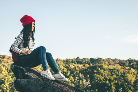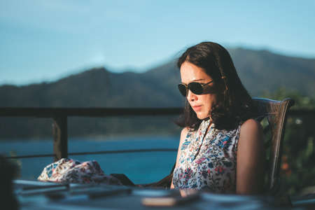 portrait of Asian tourists woman sit on balcony at Tea garden doi angkhang Thailand, vintage effect