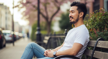 Handsome asian man sitting on a bench in the city