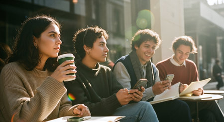 A group of young adults sitting outside at a cafe, engaged with their smartphones and a notebook, enjoying a sunny day