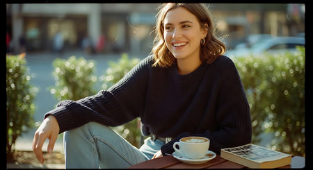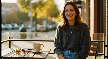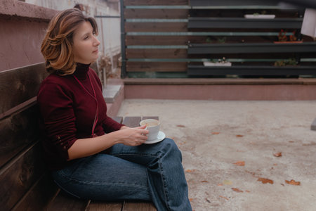 A young woman sits in contemplation against a backdrop of autumn trees, the sunlight casting a warm glow as she reflects on life and enjoys the peaceful outdoor setting.