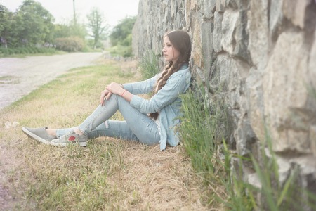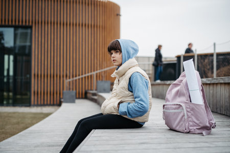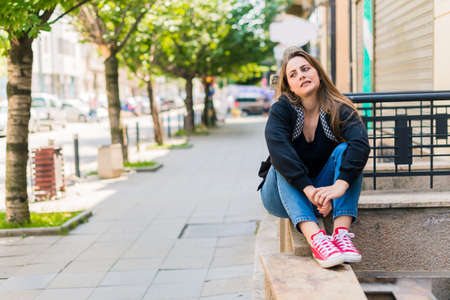 Sad girl alone, sitting in front of school building, waiting for parents. Young schoolgirl with no friends, feeling lonely.