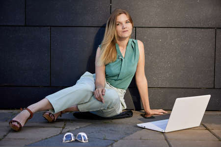 Young caucasian woman with laptop sits outside.
