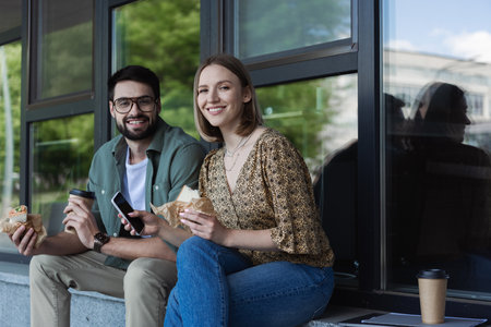 Smiling business people holding sandwiches and smartphone while looking at camera near building outdoors