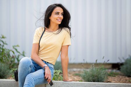 Young woman with mobile phone sitting on concrete parapet. Brunette in yellow hoodie and red jacket browsing smartphone in cloudy weather