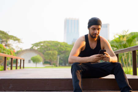 Young handsome bearded Indian man using phone while sitting at the park