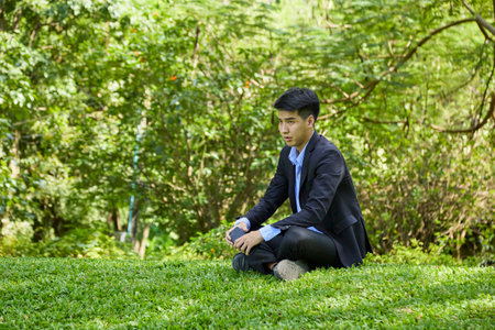 A young Asian businessman relaxing in a nature park