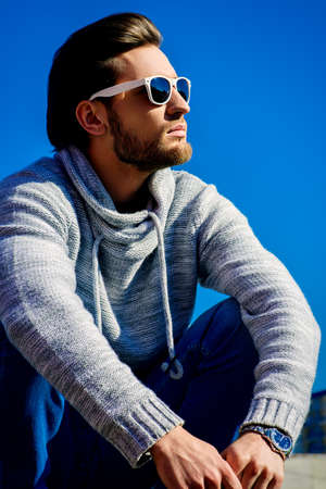 Young handsome man in casual clothes and sunglasses over blue sky. Men's beauty, fashion. Outdoor portrait.