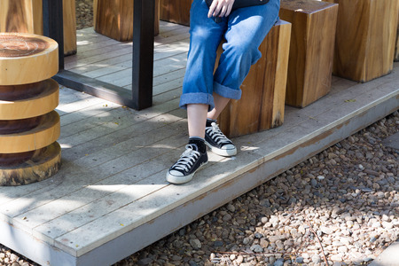 woman wearing blue jeans and black sneaker sitting and waiting