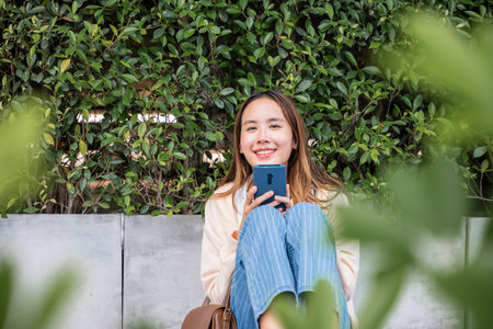 In a tranquil park on a lovely spring day a cute woman sits with her bicycle using her mobile phone to listen to music with earphones. Her joyful typing and bright smile capture essence of season.