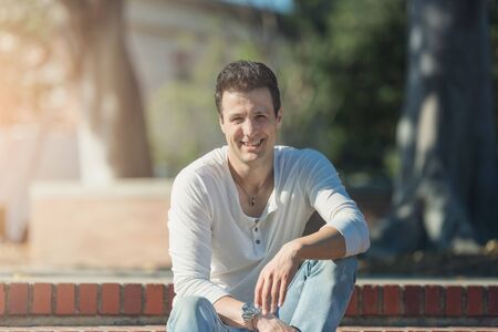 Handsome casual happy man sitting on stairs, looking away.