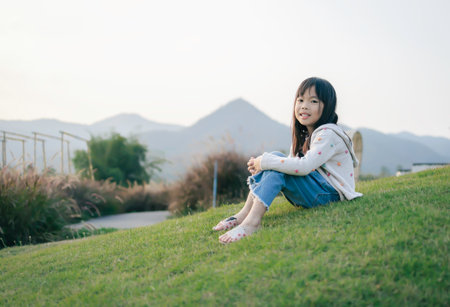 Little asian girl sitting on the grass in the park and smiling