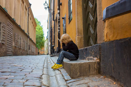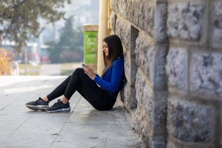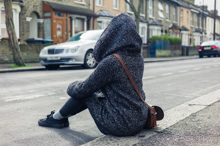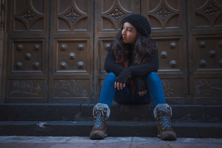 alone Stressed urban woman sits next to the brick wall on the street in city.