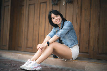 Summer sunny lifestyle portrait of young stylish hipster woman walking on the street, wearing cute trendy outfit. Young Asian women tourist traveler smiling in bangkok. street fashion