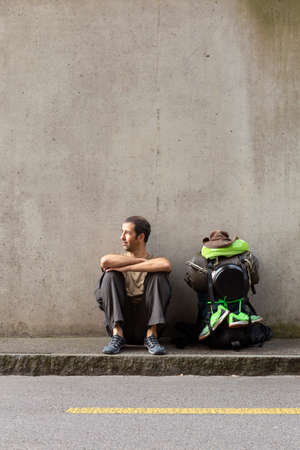 A single white adult man with a packed backpack sitting on the roadside in front of a gray wall taking a break from hitchhiking