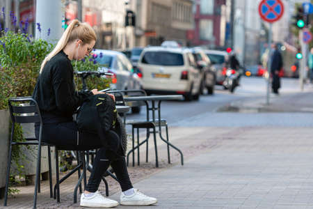 Riga, Latvia - October 8, 2020: a young woman in sunglasses sits at a table on the sidewalk on the side of the street and drinks coffee