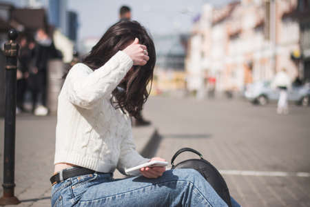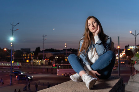 Beautiful young girl sits on evening city background. Stylish student girl lonely sitting on the high step.