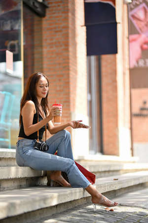 Portrait of attractive asian woman with shopping bags, retro camera, coffee to go and smartphone in hand sitting on stairs on street mall