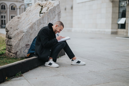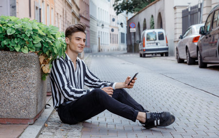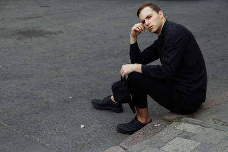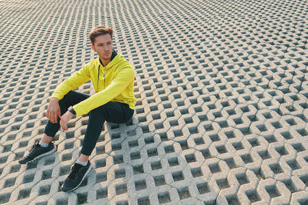 Candid portrait of a trendy handsome young man in city. Caucasian in early 20s man sits on the parking lot ground in urban setup. Looking away. Casually dressed. Lifestyle Millenials. Short hair