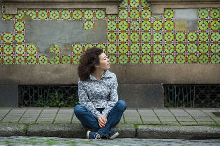 Asian woman sitting on the sidewalk in front of houses in Porto, Portugal.