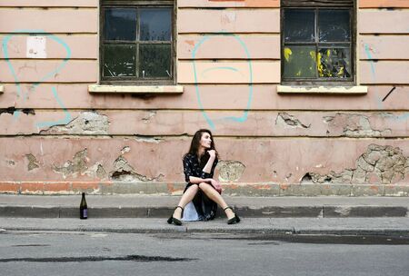 beautiful slender young woman sitting on the road next to a wine bottle on the background of an old building in the city