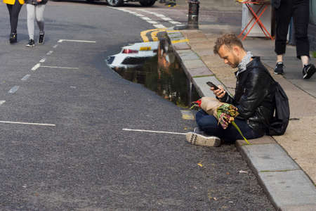 LONDON, ENGLAND - October 12, 2018 A young man sits on the sidewalk near the flower market
