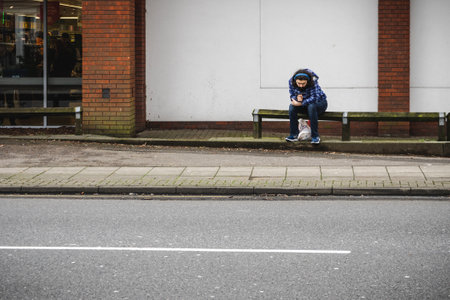 02/18/2020 Portsmouth, Hampshire, UK A man sitting alone on a wall in the street watching his phone screen and wearing headphones
