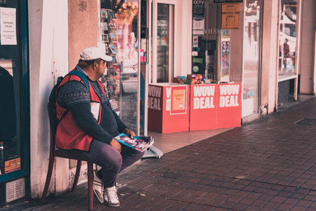 04/04/2020 Portsmouth, Hampshire, UK A big issue seller on the the street sitting alone