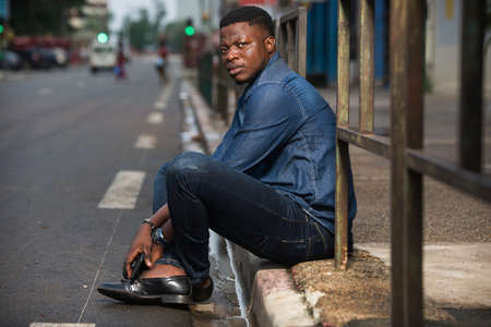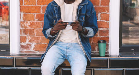 Portrait of fine-looking man outdoors. African American man in casual clothes sitting, posing. Portrait, city life concept