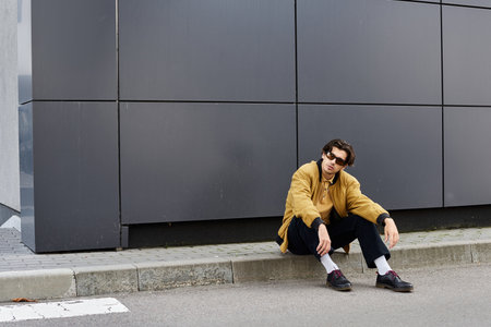 A young man showcases his autumn fashion while confidently posing on the curb near contemporary architecture.