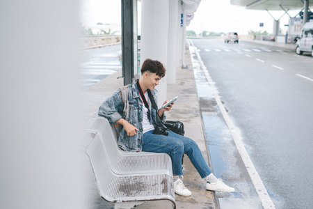 Portrait of smiling man texting while sitting at the bus stop in the airport