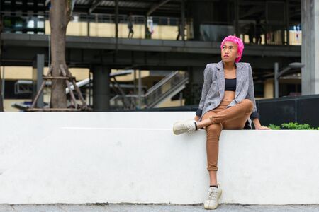 Full body shot of young rebellious Asian businesswoman thinking in the city