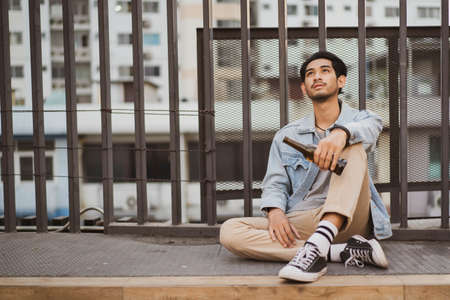 Hopeless and alcohol addicted in unemployed asian young man sitting alone beside the road with beer bottle. Life failure, depression, fear and crisis issue concept. Photograph with copy space.