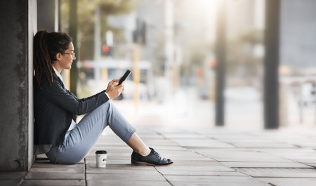 Phone, woman and coffee break in the city, street or job search, employment or network on social media, internet or online. Unemployed, worker sitting and reading news or wanted ads on cellphone