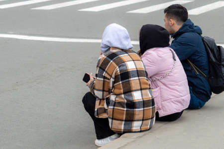 Petrozavodsk, Russia - 9 May 2022. young people sitting on the edge of the road. selective focus