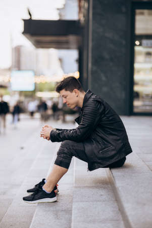 Young handsome hipster guy with sunglasses in fashionable black clothes with jacket and stylish white sneakers sitting on the street