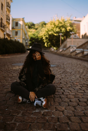 Outdoor portrait of a young beautiful fashionable lady sitting on stairs of old building on a street of the old city. Model wearing stylish clothes. Female fashion concept. City lifestyle