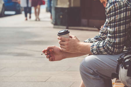 Man in a check shirt is sitting in the street and holding a cardboard cup of coffee and a cigarette. City walks, takeaway coffee, outdoor smoking. Free space for text. Toned image with soft focus.