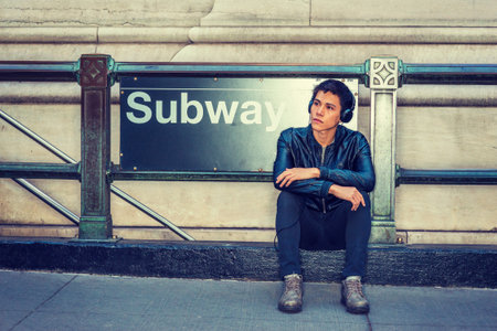Asian American college student traveling in New York, wearing black leather jacket, pants, boot shoes, headphone, sitting on street by Subway station sign, listening music.