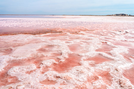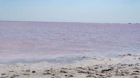 View of the pink Lemur Lake on the Arabat Spit in Ukraine. Unique pond with Dunaliella Salina algae, salt crystals and healing mud. Dead Sea analogue