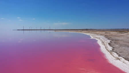 Aerial drone top down photo of a natural pink lake, blue sky and coast Kuyalnik in Odessa, Ukraine. Lake naturally turns pink due to salts and small crustacean Artemia in the water