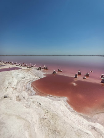 View of the pink salty Syvash lake in Kherson region, Ukraine