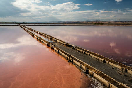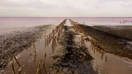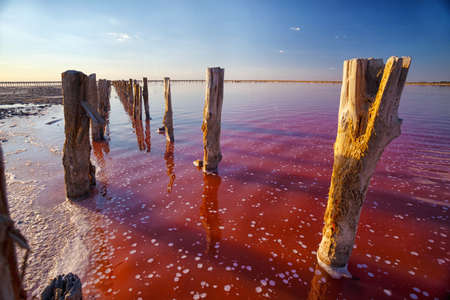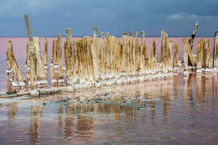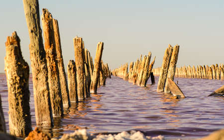 Salty pink lake. Wooden supports of the old wooden bridge stick out above water surface. Unique color of the lake is given by halophile microalgae Dunaliella salina.